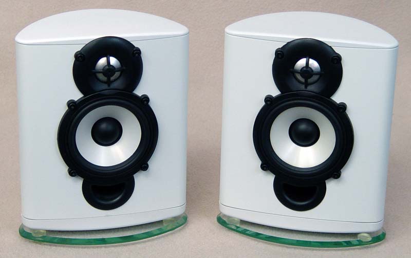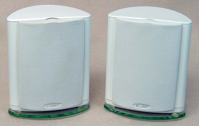 Very Cool Looking and Excellent Sounding Energy Satelite SAT W-1 Speakers. Curved White Cabinets with Green Glass Base. Dims: 8 1/4"T x 6 1/4"D x 3"D. 3" Woofers with 1" Tweeters.Ex.Cond 8.8
