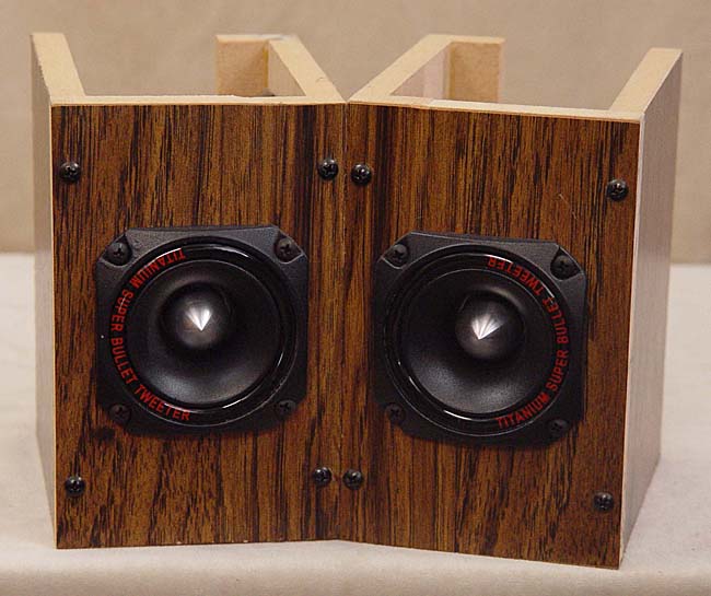 Add Highs to Your Old Speakers with Pyramid Brand TW-44 Titanium Super Bullet Tweeters. 1.25" Diaphram. Mounted in Woodgrain Over MDF Stands. Dims: 7"T x 4.25"W x 6.5"D. Built-in Crossover. Max Rating 300 Watts. 8 Ohms. Ex.Cond 9.0