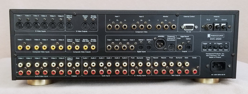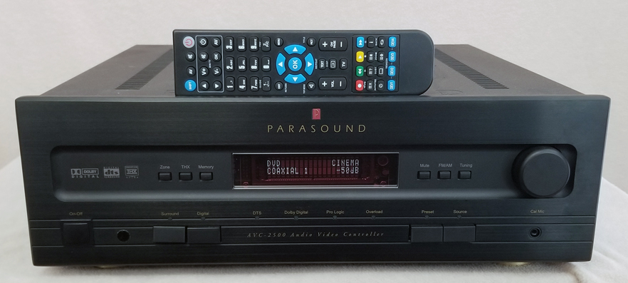 Description: Parasound AVC-2500 Surround Processor. Features: Dolby Digital, DTS, THX-Ultra Processing, FM/AM Tuner w/ 20 Presets, Automatic Input Selection, 6 Audio/Video Inputs Each With Composite and S-Video Inputs, 6 Audio-Only Inputs, 7 Digital Inputs (6 Coax, 2 Optical, 1 AES/BEU) 2 Component Video Inputs, Individually Assignable, On-Screen Display, Dual Zone Control, Two 12-Volt Triggers. Remote Included. Ex. Cond. 9.0