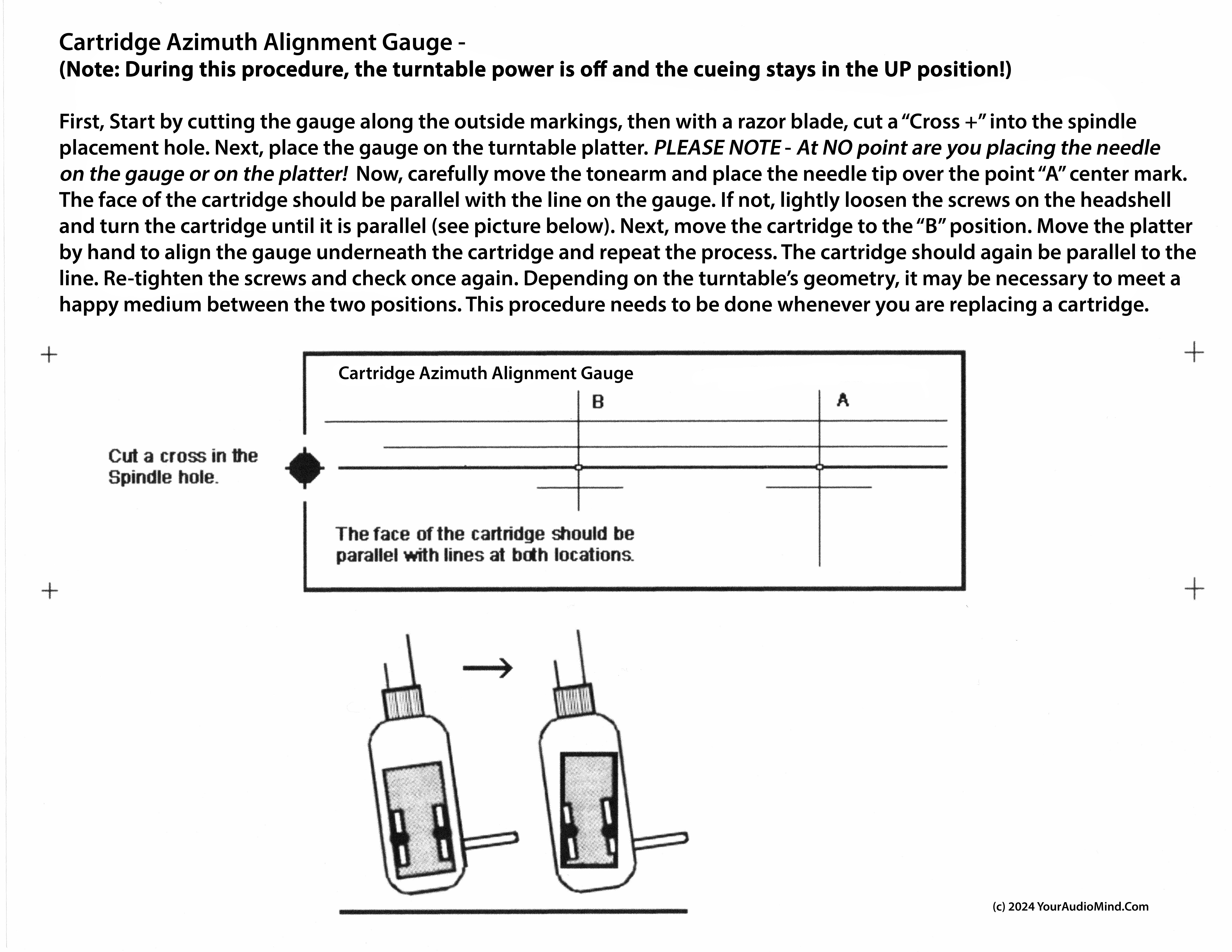 Here are your Free Turntable Speed Disk and Cartridge Tracking Error Azimuth Gauge DownloadsUse the Stroboscope to quickly check to see if your turntable is running at the correct speed and use the Tracking error guage to make sure that your cartridge and needle are properly aligned. Simply click on the pictures below or their links and print them out on your printer. They are pdf files and require adobe reader (freeware at adobe.com) or another pdf reader. Both files will print out on standard 8.5"x 11" paper, cut them out and they are ready to use. Do not reduce the size of the image. It must be full size in order to be properly calibrated to speed. We recommend you experiment with regular paper first, which works fine, but you might want to try printing them on 80# - 100# card stock or as heavy of paper as your printer will handle. Also you should flip the stroboscope disk over and print the second disk on the opposite side. The center holes should line up. If not, flip the page upside down when you print the second side. Use a razor blade to carefully cut an X into the center hole. Place the Stroboscope disk on the Turntable platter. Cue the tone arm up so your needle will not touch the disk. Set the appropriate speed and turn on the turntable. View under fluorescent light. Note carefully which row of dots appears to be standing still. If speed is fast or slow, adjust so the large center row of dots, marked with the RPM designation, appear to be still. In addition, the outside strobe markings are set in gradients of +/- 2% and +/- 4% speed deviation. These can be helpful when checking tables with no speed adjustments.